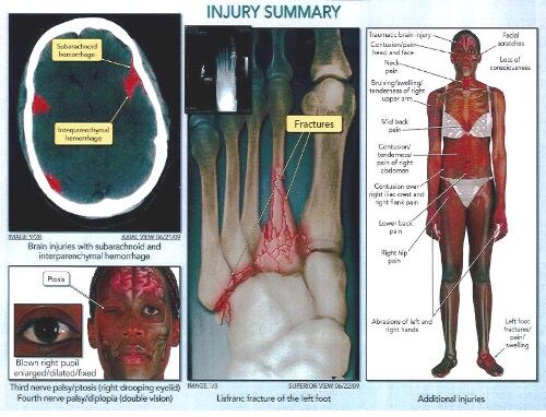 Our client sustained multiple and catastrophic injuries and required extensive medical evaluation and treatment. At the hospital emergency room, it was noted that she had suffered a loss of consciousness at the scene and had no recollection of the collision. She was found to have sustained a traumatic intracranial hemorrhage, subarachnoid hemorrhage with an intraparenchymal component, a blown right pupil, ptosis (eyelid drooping) and diplopia (double vision). Consultation by neurosurgeon revealed that the intraparenchymal injury was close to the optic nerve and she was left with a third nerve palsy. Ultimately, fourth nerve palsy was diagnosed as well. She was also experiencing severe pain in the left foot and subsequent x-rays showed a Lisfranc’s fracture. She also suffered neck and back soft tissue injuries as a result of the wreck.